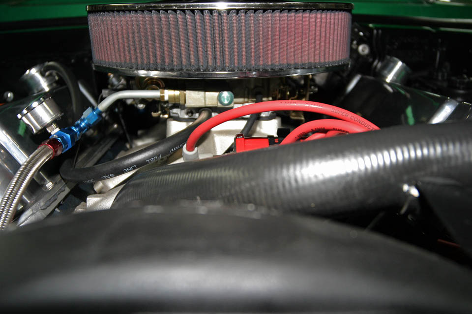 Edelbrock Performer RPM 850 cfm carb, blue Holley fuel pump with regulator, 14 K&N air cleaner