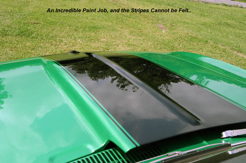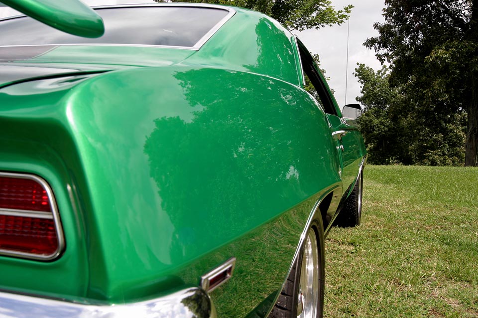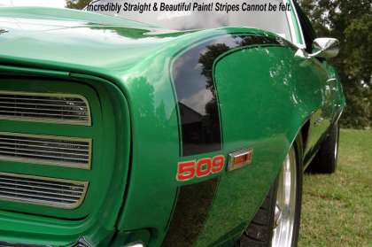 Paint is PPG Clapton Green polyurethane with gloss black Baldwin Motion style striping, 4 coats of clear, wet sanded and buffed.