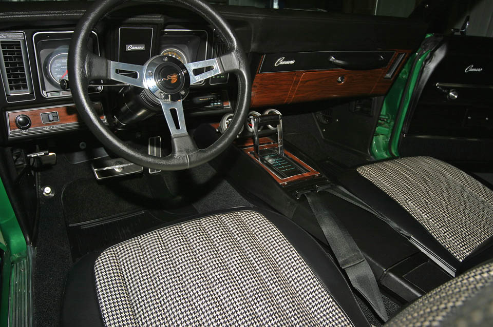 New Black Houndstooth interior with new carpeting, headliner, door panels, dash pad, rear seat, console, Autometer gauges, Alpine AM/FM/CD stereo with (4) Polk Audio speakers